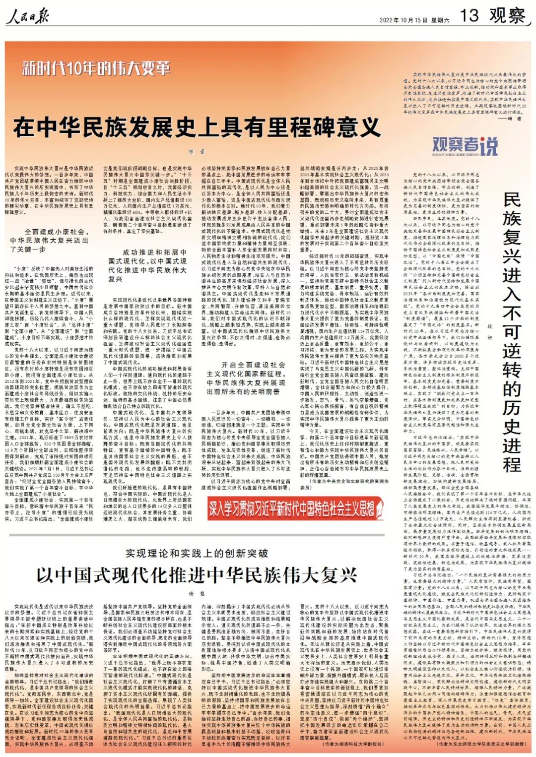 实现中华民族伟大复兴是中华民族近代以来最伟大的梦想。党的十八大以来,以习近平同志为核心的党中央团结带领全党全国各族人民自信自强、守正创新,推动党和国家事业取得历史性成就、发生历史性变革,创造了新时代中国特色社会主义的伟大成就,成功推进和拓展中国式现代化,实现中华民族伟大复兴进入了不可逆转的历史进程。本期观察版围绕新时代10年的伟大变革在中华民族发展史上具有里程碑意义进行阐述。